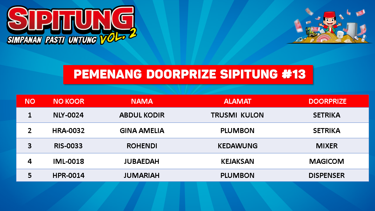 Demikian daftar pemenang undian door prize dan tarikan SIPITUNG Vol. 2 #13. Demi kelancaran pelaksanaan pengundian SIPITUNG Vol. 2 dimohon untuk melakukan pembayaran maksimal pada tanggal 15 setiap bulannya. Pelaksanaan pengundian SIPITUNG Vol. 2 #14 akan diinformasikan melalui Koordinator masing-masing. Selamat dan terima kasih.